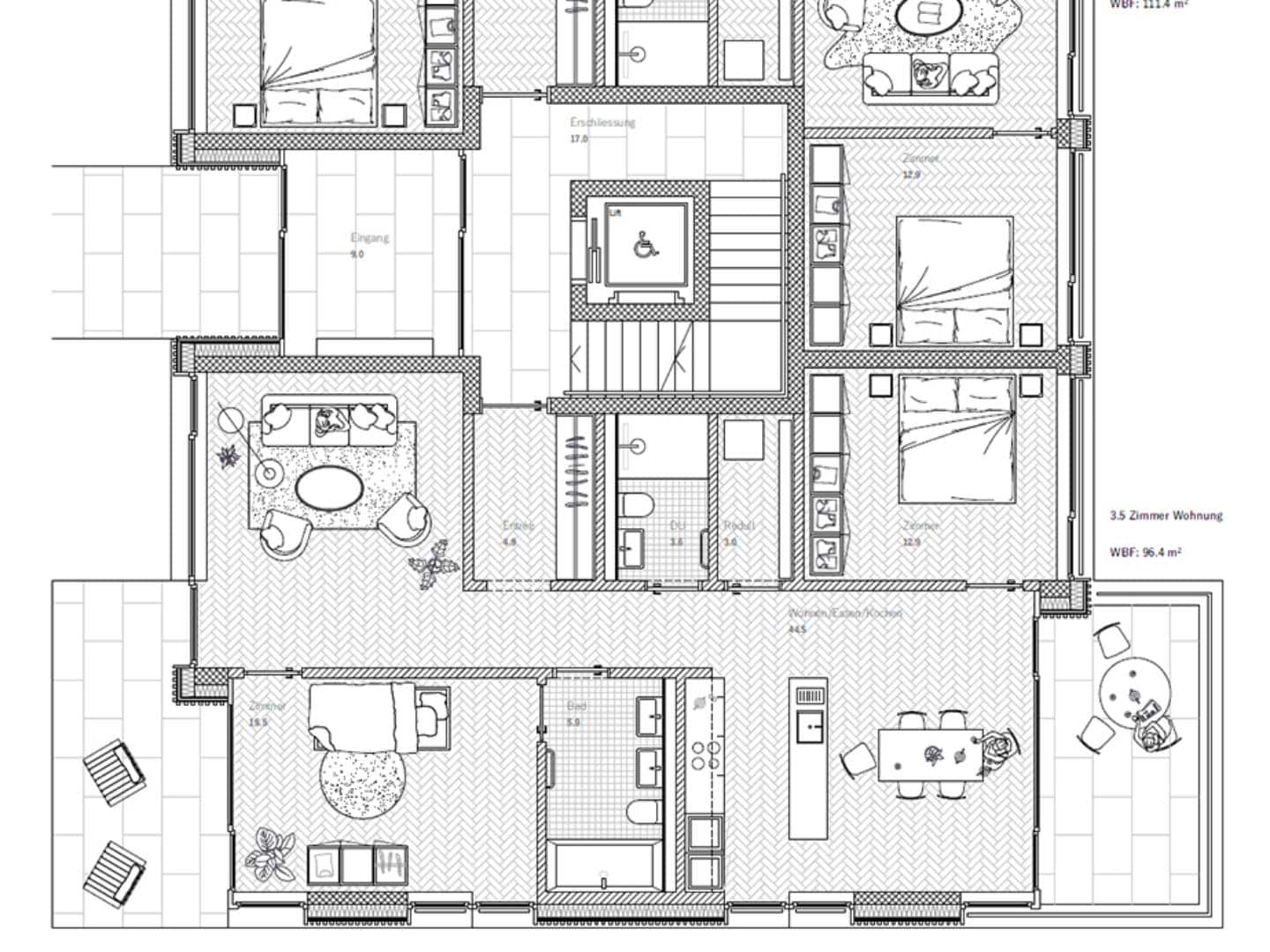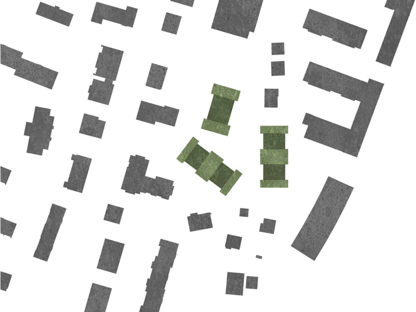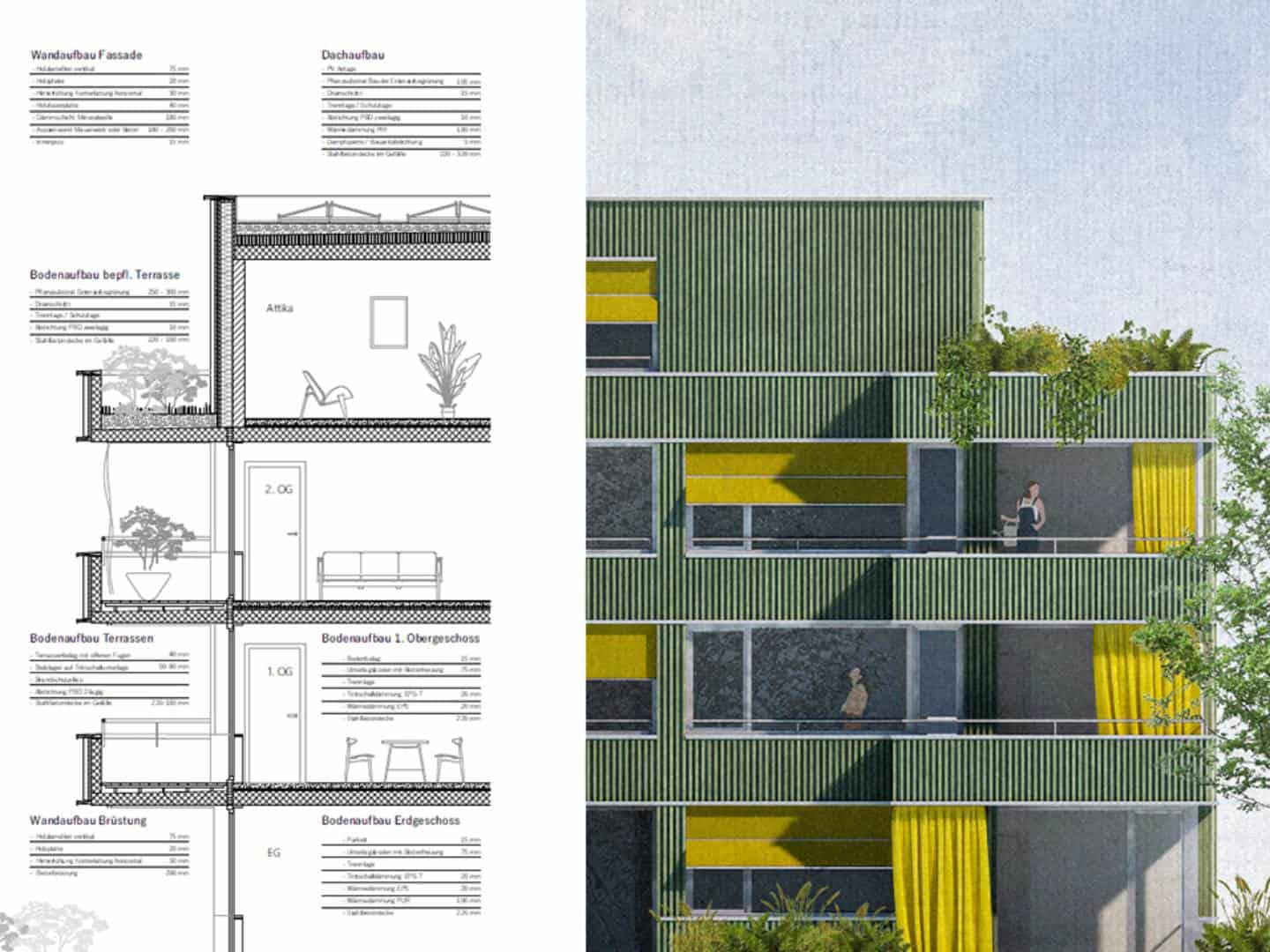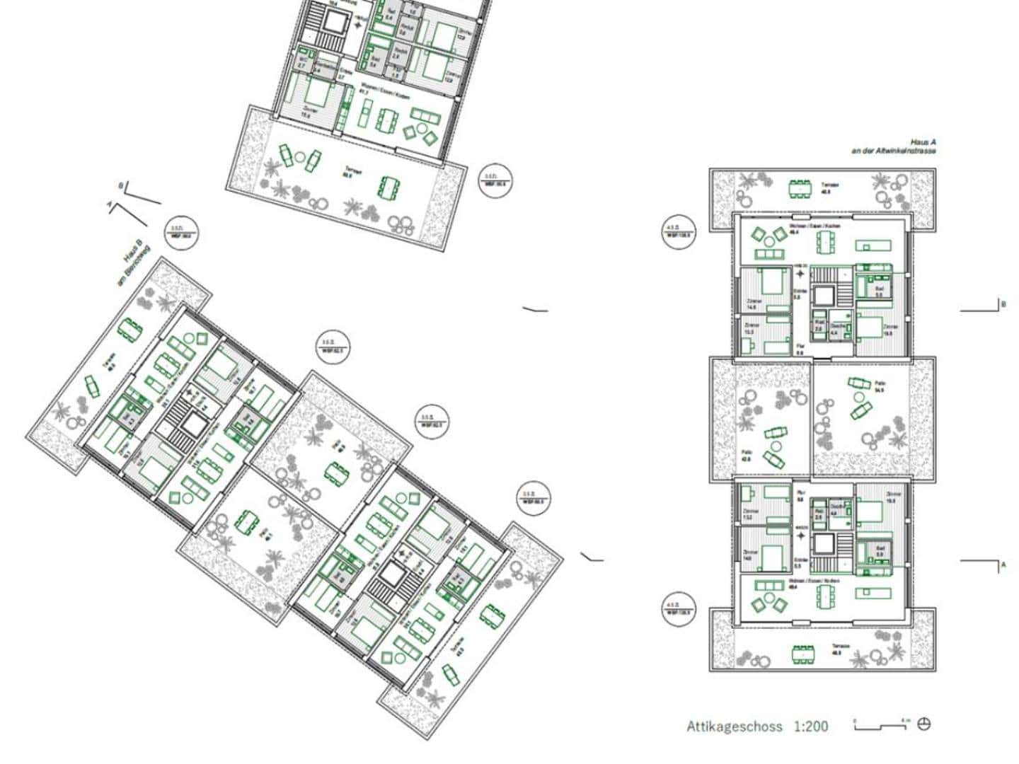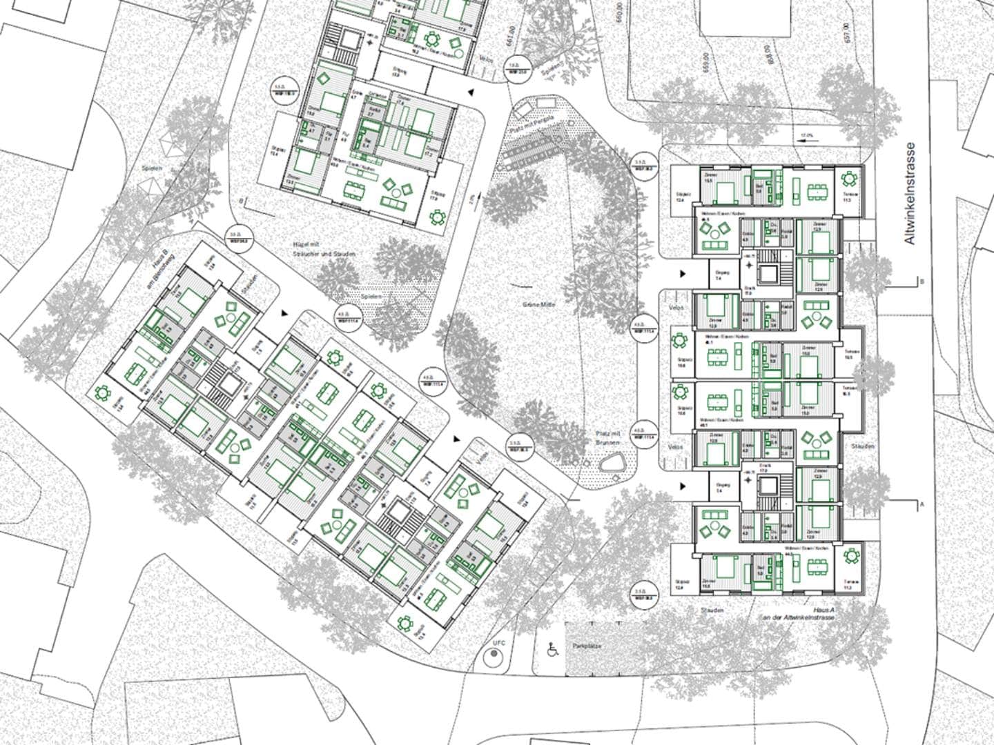 Ein Ensemble von dreigeschossigen Gebäuden mit Attika gruppiert sich um einen begrünten Aussenraum, der den Blick zur Kirche hin frei gibt. Das dritte kleinere Gebäude wird gegenüber dem Bestand um neunzig Grad gedreht und an der Ostseite der Kirche ausgerichtet. So wird ein ortsbaulicher Bezug zu diesem markanten Baukörper aufgebaut. Über den zentralen Hof als grüne Mitte werden die drei neuen Gebäude fussläufig erschlossen. Die Häuser an der Altwinkelnstrasse und am Blériotweg haben jeweils 16 Wohnungen, das kleinere Haus bei der Kirche hat 11 Wohnungen, es entsteht eine Bebauung mit insgesamt 42 Wohneinheiten. Die vier Wohnungen je Geschoss der beiden grösseren Häuser werden über zwei Treppenhäuser erschlossen. Die Wohnungen orientieren sich nach innen zur grünen Mitte als auch nach aussen zur umliegenden Landschaft mit dem Blick ins Appenzeller Land.